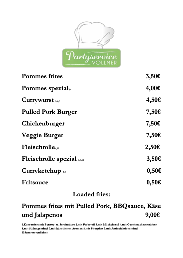Einen weiteren Vorgeschmack bietet die Speisekarte vom Partyservice Vollmer. Schaut sie euch hier an und freut euch darauf euch beim Luft schnappen zu stärken, um dann weiter abzurocken!